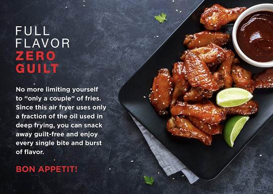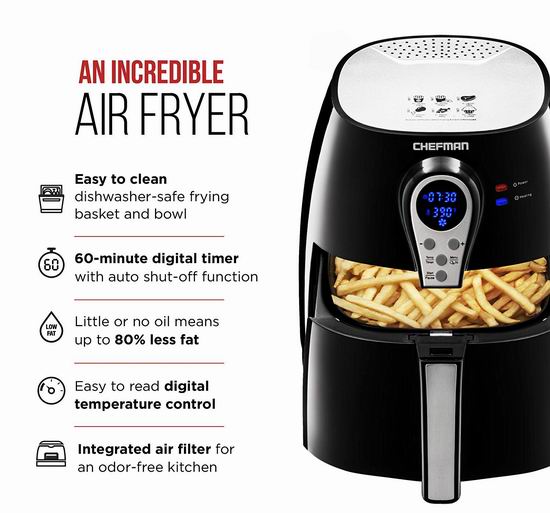 采用高温热气循环快速加热技术,使其外焦里嫩,不需要加入油脂,油脂从食材分解中来,对于无油食材(如薯条、虾等),就要先涂一点油,可做出比传统油炸方式降低脂肪量达80%的美味食物。可编程数字式控制,60分钟数字定时,175-400度温度调节,容量高达2.5升,油炸篮可放入洗碗机清洗。