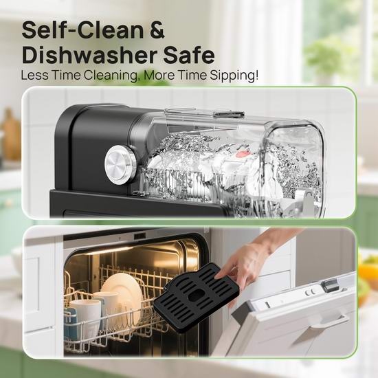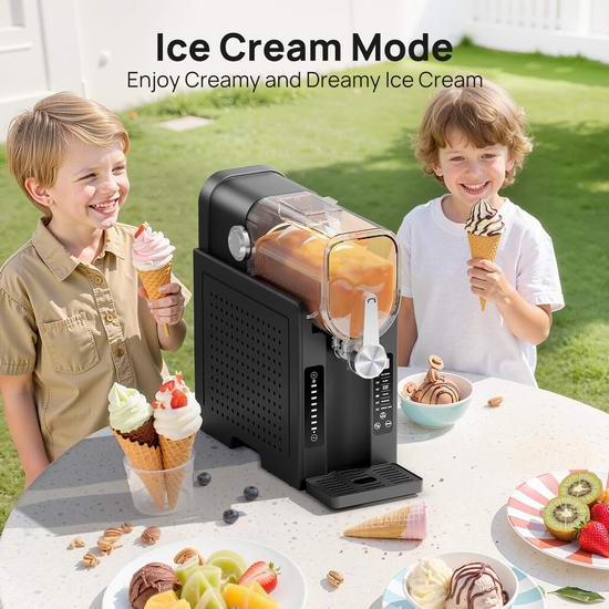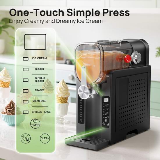 采用内置的高性能压缩机与速冻技术,可将果汁、咖啡甚至葡萄酒等液体快速制成顺滑冰沙。具有6种预设程序(冰淇淋/冰沙/含酒精冰沙/冰镇果汁/奶昔/星冰乐)与LED显示屏,便于精确控制。其预约功能最长支持12小时,适合提前准备。68盎司的最大容量约可制作5–6杯饮品,建议安全容量为54盎司。维护方面,机器具备自清洁功能,且可拆卸部件可放入洗碗机清洗。
