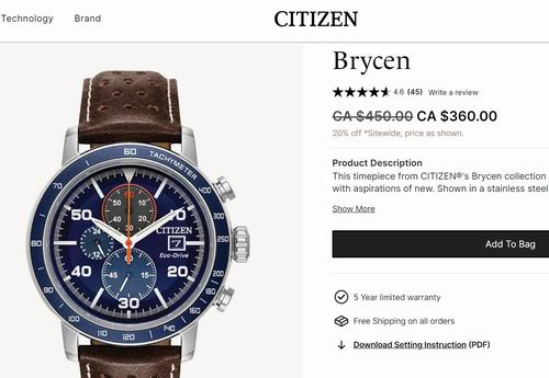 Citizen 西铁城 CA0648-09L Brycen 男士光动能三眼计时腕表 224.98加元(官网价原价 450加元)