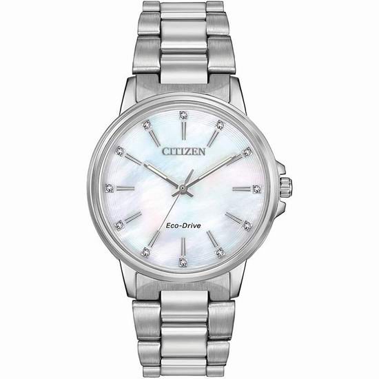 采用西铁城光动能机芯,无需更换电池,银色不锈钢外壳和表链,款式经典大气,防刮水晶表镜,夜光指针,贝母表盘,镶嵌施华洛世奇水晶装饰,表径37毫米,50米生活防水。