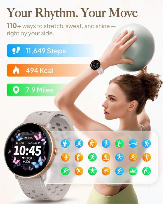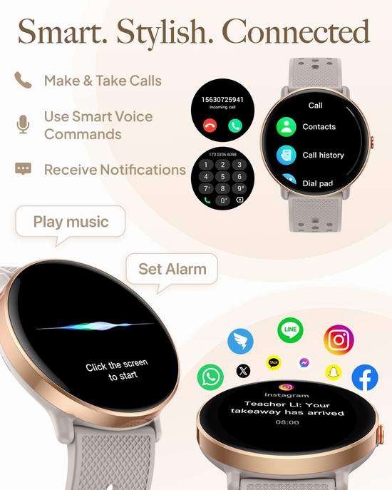 这款智能手表配备1.39英寸高清触控屏,亮度提升30%,触控响应灵敏,具有200多种预设表盘。内置高清扬声器,配对手机后,可直接通过手表接听电话,降噪麦克风即使在嘈杂的环境中也能清晰通话。支持即时接收短信、WhatsApp 以及 Instagram 和 Twitter 等常用应用的通知,让您随时掌握最新动态。自动记录每一步和消耗的卡路里,具有112种运动模式。获取个性化的运动表现分析,优化您的技巧,达成目标。IP68级防水,可抵御汗水、泳池水花和雨水。