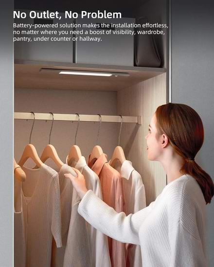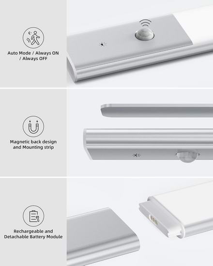 这款可调光橱柜灯提供5700K冷白光效果,可调节亮度。内置运动传感器,感应范围10 英尺/120°,检测到运动时LED灯亮起,运动停止15秒后自动关闭。具有常亮模式,提供长时间持续照明。搭载1500mAh可拆卸可充电电池,在最高亮度下可持续照明长达6小时,在自动模式下,可提供20天(每天75次开启)至45天(每天30次开启)的续航时间。内置磁铁,可牢固吸附在金属表面。对于非金属表面,随附的粘性铁片可实现快速安装。外形尺寸为40 x 4.2 x 1.5厘米。