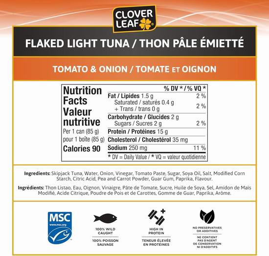 Clover Leaf 番茄洋葱味 金枪鱼罐头(85克 x 24罐)5.4折 25.99加元!单罐仅1.08加元!