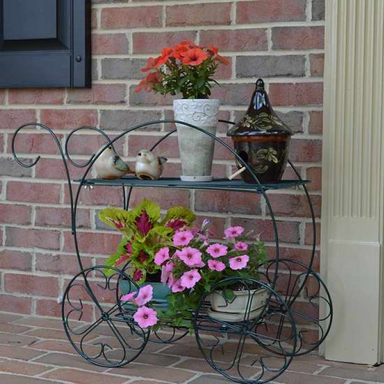 采用钢结构,深绿色防锈乙烯基包裹,双层花园推车造型,用于放置盆栽植物,外形尺寸为26 x 10 x 25英寸。