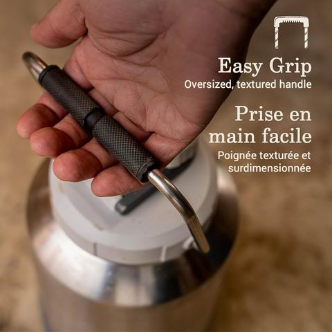 采用不锈钢真空保温壶身,持久保冷、坚固耐用,适合严苛户外与工地使用。壶盖带防漏设计且与壶体连接防丢失,并设有纹理握把便于抓握,壶身配有可拆卸硅胶防滑套。侧面固定点可挂扣携带,并提供5年质保。