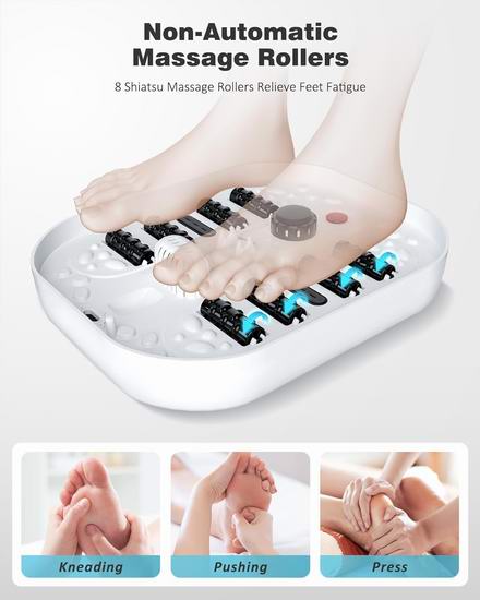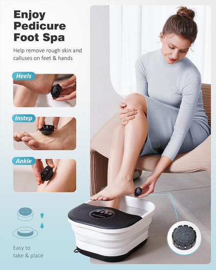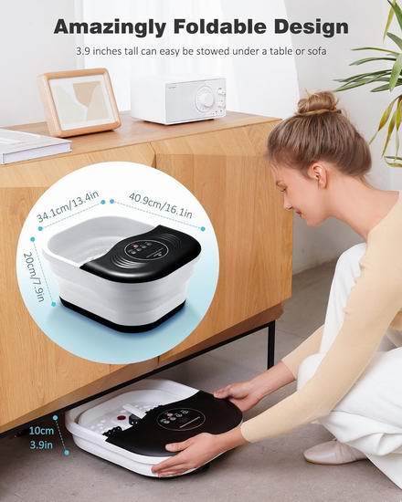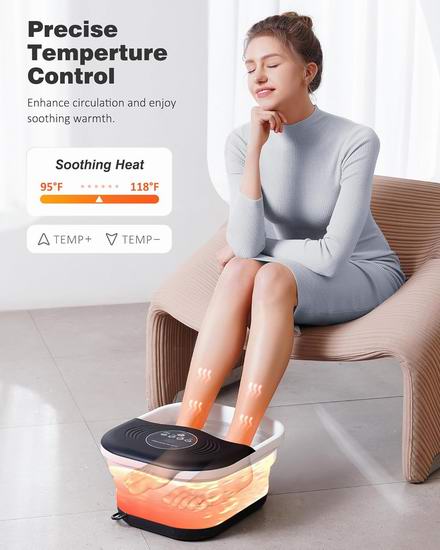 这款足浴盆结合了加热、按摩、氧气泡、浮石去角质等功能,可放松您过度劳累的双脚。配有8个可拆卸滚轮,可全方位按摩足部穴位。智能温度控制,可将水快速加热至您设定的温度(35℃-48℃),并在整个水疗过程中保持水温,无需额外添加热水。泡泡出口释放出许多活性氧气泡,包围并敲击您的足底压力点,结合振动按摩功能,有效放松您的身体,支持10-60分钟定时关闭。可折叠设计,存放时节省空间。