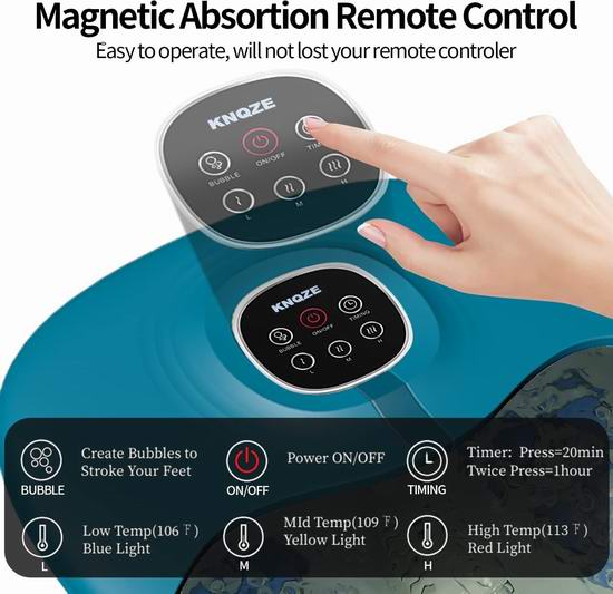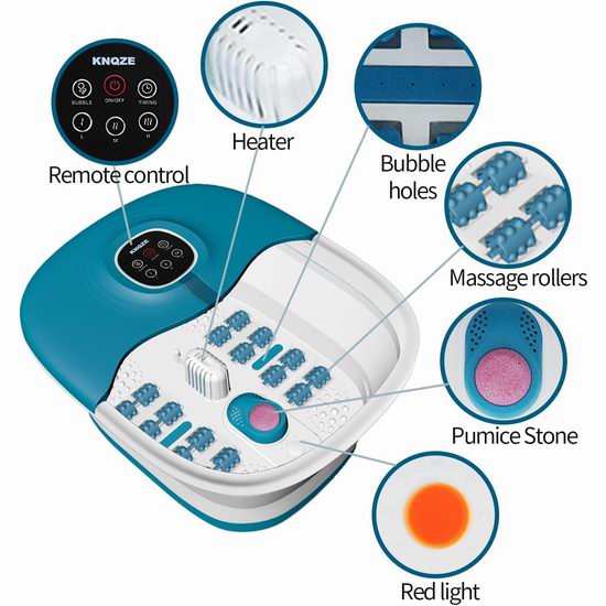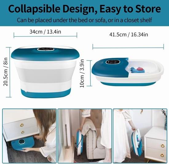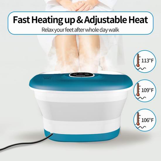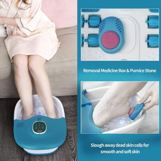 这款多功能足浴盆集加热、气泡、震动、按摩滚轮、浮石和红光功能于一体,通过轻柔按摩和舒缓疲惫的双脚,让您彻底放松。内置药盒,可以放置草药包,呵护双脚。具有3档热量,最高温度可达45℃,支持20-60分钟定时关闭,配备遥控器。采用可折叠设计,折叠至4.1英寸厚,方便收纳。