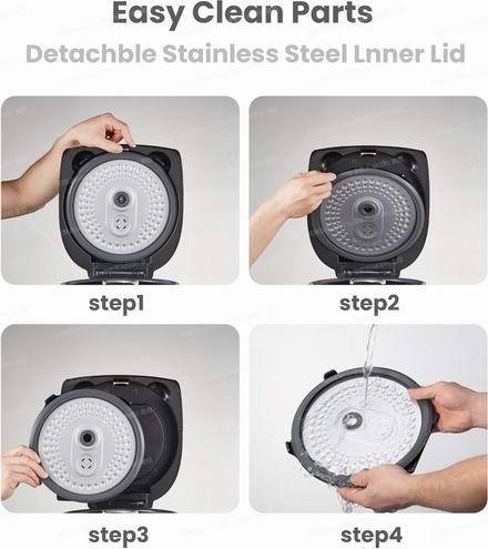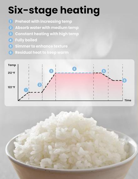 COMFEE'智能电饭煲采用模糊逻辑极速,智能六步烹饪流程,使蒸汽阀和内锅能够保持蒸汽和热量,确保每次都能将米饭煮得恰到好处,从而达到最佳烹饪效果。预设11种烹饪程序。从白米饭到糙米饭,从寿司到意面,从汤到炖菜,从炒菜到蒸蔬菜,这款智能电饭煲可以轻松满足家庭和聚会的各种烹饪需求。配备智能LED显示面板、支持自动保温 12 小时以及 24小时延时启动。电饭煲拥有10杯生米(5.2 夸脱)的容量,最多可煮出20杯熟米饭,或3磅肉类等。蒸汽阀可拆卸清洗,防止堵塞;内锅采用不粘涂层,易于清洁。