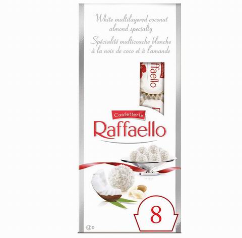 拉斐尔椰香杏仁糖以香脆白杏仁为芯,外层包裹丝滑奶油与酥脆椰蓉,不含巧克力。采用独立包装,每盒8颗共80克,注重原料品质与工艺,保持新鲜口感。