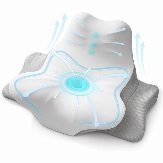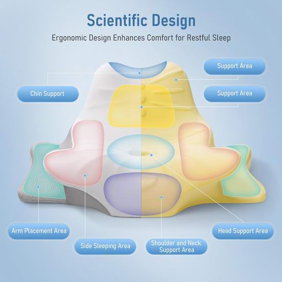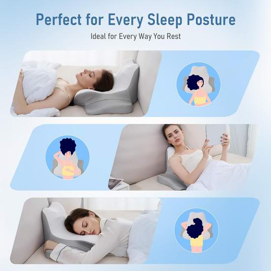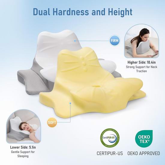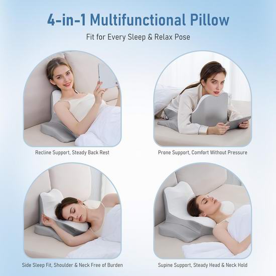 这款枕头采用四合一设计,具有两种不同的弧度高度,较高的一侧用作俯卧或斜倚枕,方便阅读或使用手机,较低的一侧适用于多种睡姿,例如侧卧、俯卧、仰卧和低枕睡姿。枕头采用独特的双芯设计,坚实的内芯为颈部和肩部提供强劲支撑,确保完美贴合。柔软的内芯则带来舒适的睡眠体验。这种双重硬度的组合带来真正独特的睡眠体验,尤其适合颈部疼痛或僵硬的人群,兼具稳定性和舒适性,有效支撑头部、颈部、肩部和背部肌肉,又足够柔软,确保您的身体获得最大的舒适度和放松感。枕套采用透气仿冰丝面料制成,完美贴合肌肤,让您整晚保持凉爽舒适。