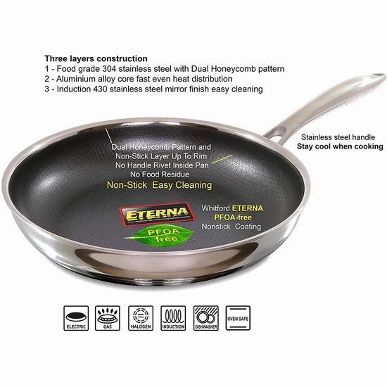 “蜂窝不粘锅” 在市场上受到消费者热捧,不仅互联网平台销量逐年攀升,社交平台上也收到无数称赞,成为消费者心中口碑爆棚的不粘锅;这款备受追捧的Potinv蜂窝不粘锅是目前市场上炙手可的香饽饽。整锅一体成型,采用三层不锈钢锅体,内层为304食品级不锈钢,不含PFOA,双蜂窝晶纹不粘锅体,强化速热导磁,受热均匀且快,食物始终悬浮于锅壁物理颗粒之间,不易粘锅,清洗也变得相当简单。适用于各种电炉、煤气炉和电磁炉,其中11英寸款配备钢化玻璃锅盖。