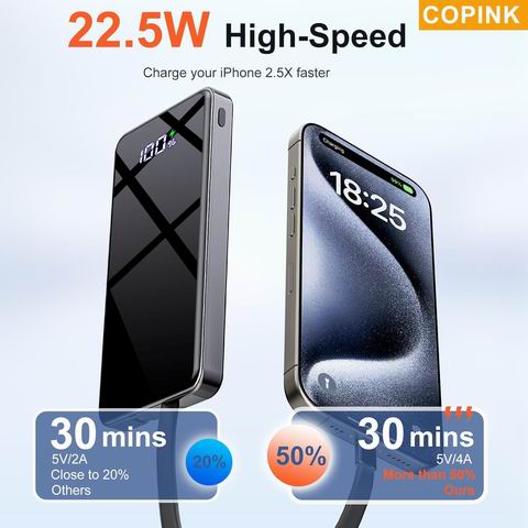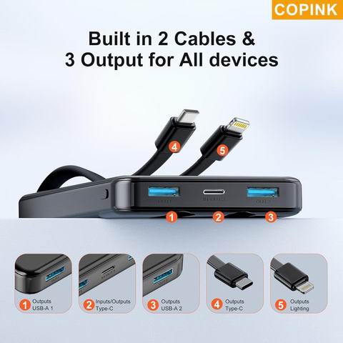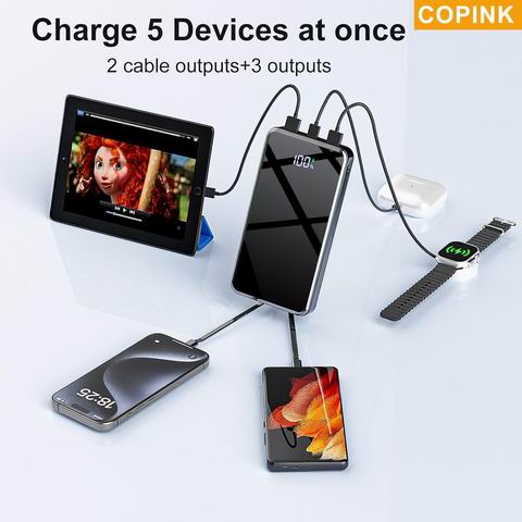 这款 25000mAh 大容量移动电源内置 Lightning 和 USB-C 充电线,无需额外携带线缆即可为主流手机和平板设备充电,出行更轻便。配备 5 个输出端口(内置 Type-C 线、Lightning 线、2 个 USB-A 端口和 1 个 USB-C 端口),支持同时为 5 台设备快速充电,并设有 2 个输入端口,补电更加便捷。LED 数字显示屏可实时显示剩余电量,告别电量焦虑。机身设计超薄便携,兼容多种 iOS 与 Type-C 设备,是差旅、通勤和日常使用的高效充电解决方案。