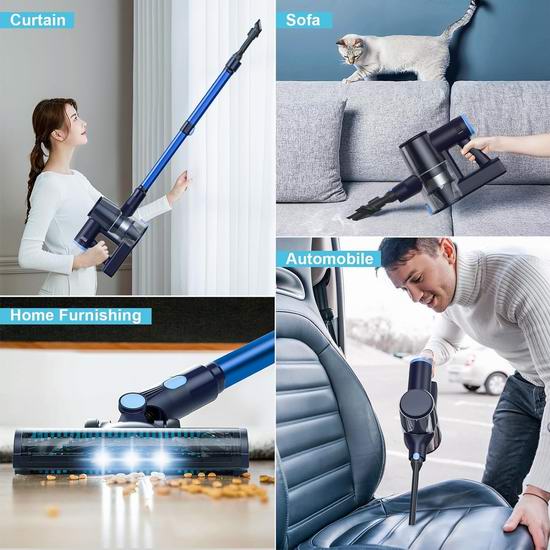 搭载最新技术的超强力250W电机,提供高达36Kpa的强大吸力,2档吸力调节,可高效快速地清洁房屋。采用全新旋风技术,高密度网格,多锥过滤,可有效捕获小至0.2微米的99.99%的微小灰尘颗粒,避免二次污染。灵活的电动刷头,可灵活地左右 180° 旋转和上下 90° 旋转,。3 个 LED 灯可帮助无线吸尘器照亮每个黑暗区域,轻松清除灰尘和污垢。配备多种配件,包括二合一刷头、加长缝隙吸嘴和伸缩吸管,可满足各种家居清洁需求。内置大容量电池,续航时间长达40分钟,MAX模式20分钟)。