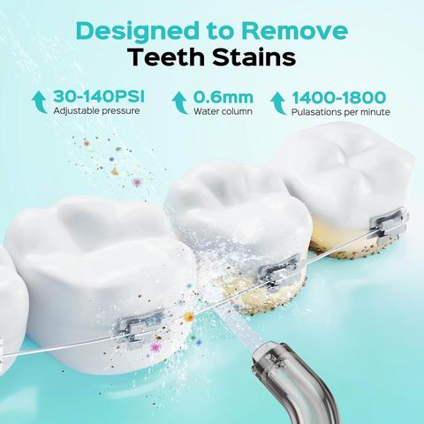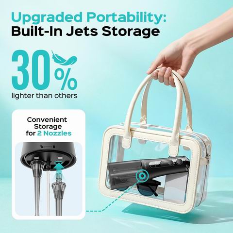 机身轻巧,内置喷嘴仓,可同时收纳两个喷嘴,免去额外收纳盒。提供3种模式×6档压力共18种组合,从儿童/长辈的柔和档到成人的深层清洁皆可满足,新手也能轻松上手。特有的按压式喷射模式能快速冲走食物残渣,且水花控制出色。配备300ml大水箱与超宽注水口,一次加水即可完成全口清洁,加水清洗都更方便。整机支持IPX7级防水,结构耐用,旨在满足长期、高效的口腔清洁需求。