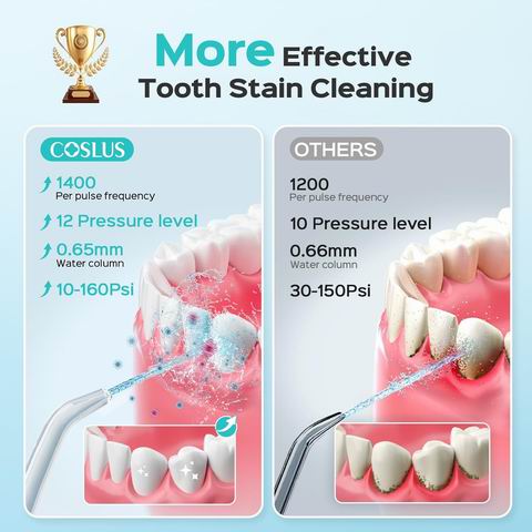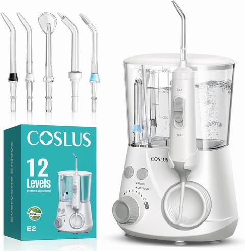 COSLUS家用便携式水牙线配备12档可调水压与5种专用喷嘴,可满足儿童、成人及老年人等不同家庭成员的洁齿需求;其600毫升可拆卸水箱、专利防尘喷嘴收纳盒及超过3年的耐用设计,兼顾多人使用的卫生性与空间收纳便利性。
