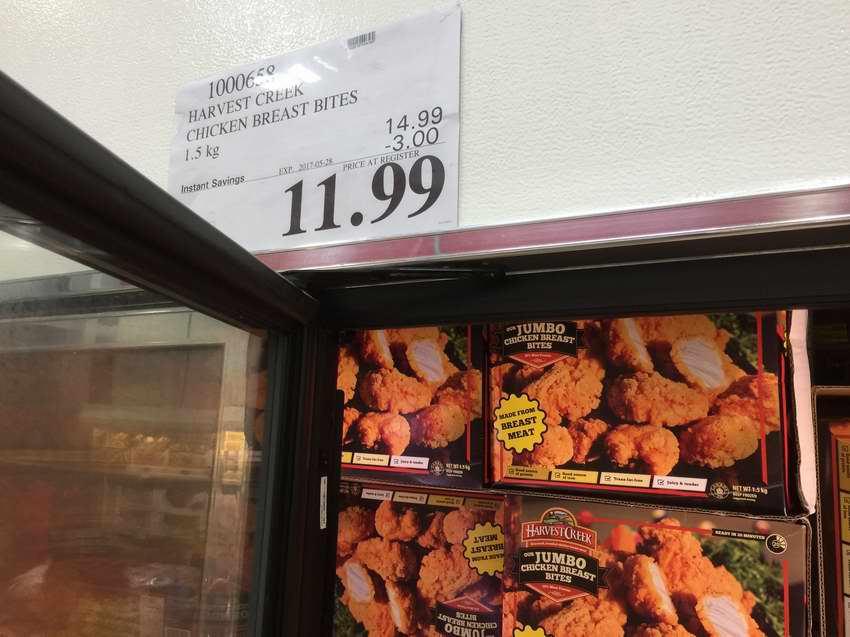 本组图于5月23日在多伦多Markham(Woodbine)店内拍摄,除常规减价促销外,价格以.97及.00结尾为清仓价,以.49及.79结尾为厂家促销价。拍摄的折扣(非清仓品)适用于加东省份的Costco店,加西及中部省份可能有部分不同。