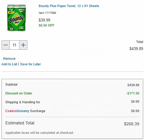 购买11件厨房纸总价268.39加元,折合单价24.4加元,比店内价格略有优势: