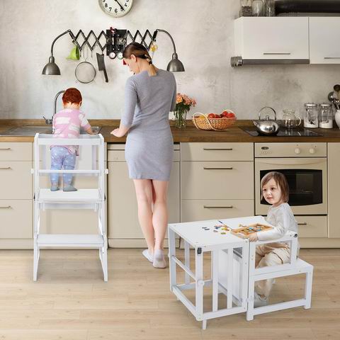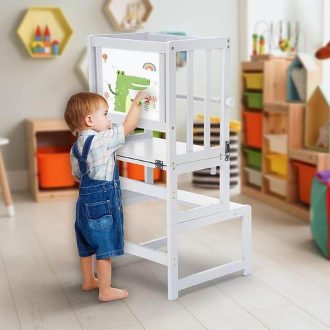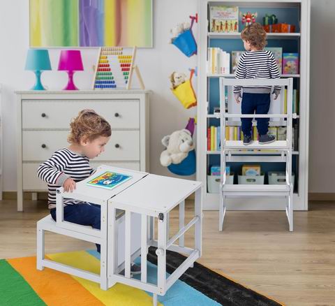 COSYLAND 三合一多功能幼儿站立塔是一款集踏脚凳、桌椅与白板于一体的儿童厨房学习助手。由坚固天然竹材制成,表面采用无毒安全涂层,通过 CPC、SOR、CE 认证,安全稳固。拆下护栏即可快速变为小桌椅,适合学习、用餐或绘画。背面配有白板,激发孩子创造力;可承重达 150 磅(约 75 公斤),适合厨房、水槽或书架等场景使用。无论是陪伴烹饪还是独立玩耍,都是促进幼儿学习与成长的理想礼物。