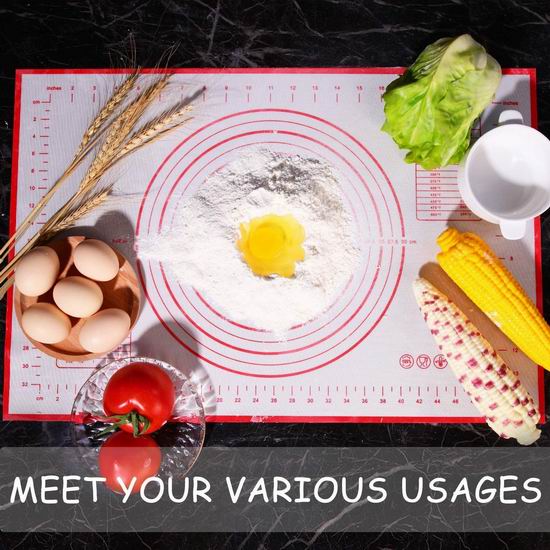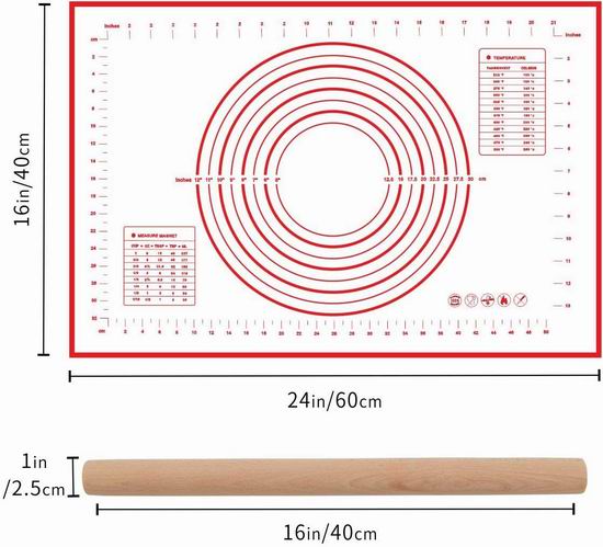 采用食品级硅胶材料制成,不含BPA和铅。柔软耐用,不会起皱或褪色,表面不粘处理,易于清洗,带刻度,便于控制面食或面皮大小。安全温度零下40°C至零上260°C,可在烤箱或微波炉中安全使用。尺寸为24×16英寸,配送实木擀面杖。