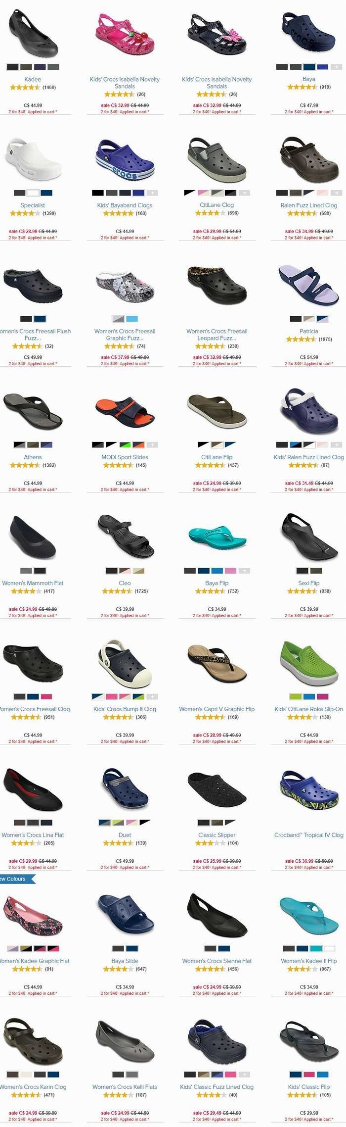 Crocs网店销售,12月11日前,精选100款成人儿童鞋履,任购两双仅售40加元,无需折扣码,加入购物车自动打折,满49.99加元包邮,点击进入订购页面