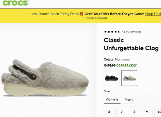 手慢断码!历史新低!Crocs Classic Unfurgettable 男女同款 雪绒洞洞鞋 毛毛鞋4折 30加元!