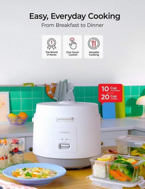采用一键式操作,轻松煮出松软可口的米饭,并在完成后自动切换至保温模式,避免过熟或烧焦。10杯生米容量可煮出约20杯熟米饭,非常适合家庭日常或宴客使用。耐用不粘内胆让烹煮与清洁更加轻松方便。这款电饭煲来自拥有40多年经验的韩国知名品牌 CUCKOO,品质可靠,不仅可煮饭,还能轻松制作汤品、炖菜和辣椒等多种料理,是厨房中的多功能实用之选。