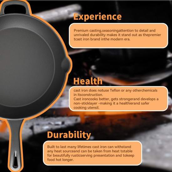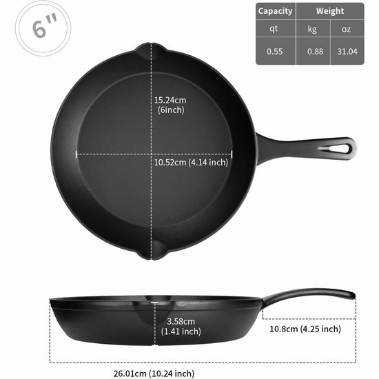 采用铸铁材质,一体成型,直径15.2厘米,植物油养锅工艺,将植物油喷在锅体表面,经高温烘烤油脂渗入铁质毛细孔中,表面形成黑色防锈、不易粘油膜,越用越不粘底,不含化学物质,安全健康,开封可立即使用,重型结构确保均匀加热和持久耐用。每次使用后,请用温水手洗,彻底干燥,并轻轻涂油以防止生锈。