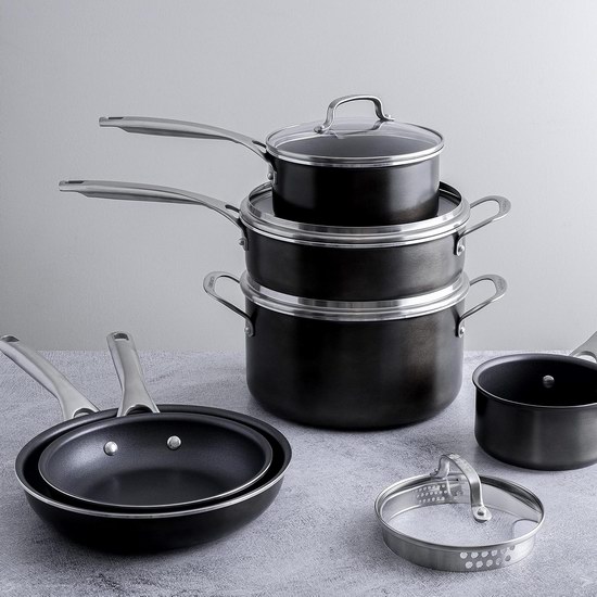 采用美膳雅独有的弹性不粘涂层,比传统不粘涂层耐用20倍,不含PFOA。铝锅结构提供卓越的导热性,加热快速均匀,铆接不锈钢手柄,隔热不烫手,包含1夸脱连盖汤锅、2夸脱连盖汤锅、3.5夸脱连盖汤锅、6夸脱连盖汤锅、8英寸煎锅、10英寸煎锅。洗碗机安全。