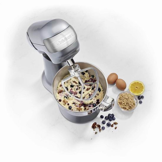 采用强力有效揉面技术,12段速度精确混合与揉面团,专业揉出所需筋性,59点行星式搅拌,搅拌零死角,抛光不锈钢揉面盆,倾斜搅拌方便物料放进盆中。3.5升容量,无论是和面、打发奶油、蛋白都更加给力轻松,搅拌面团、绞肉、制作果汁都不在话下;选择最低转速,可以处理水分较多的原料,防止泼溅;或是用于添加比较脆弱的食材;机身可向后倾倒,更方便取物。配件包括厨师机搅拌头、桨型搅拌头、面团搅拌头以及一个辅助加料的工具。