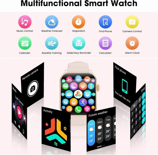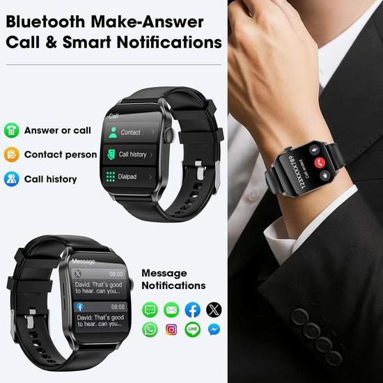全新1.91英寸曲面智能手表,完美融合时尚与创新。流畅的3D柔性表面从屏幕延伸至表带,汲取经典腕表的灵感,并融合了尖端科技,其贴合手腕的设计确保完美佩戴。内置智能语音助手,让您轻松拨打电话、查看天气预报、设置闹钟,所有操作均可通过简单的语音指令完成。内置麦克风和高品质扬声器,让您随时随地保持联系,直接在手腕上拨打和接听电话。超过120种运动模式可供选择,包括步行、跑步、骑行、瑜伽、足球、板球和力量训练。使用计步器手表监测您的运动进度,记录步数、距离、卡路里消耗、心率等数据。无需手机即可拨打电话和发送短信,随时接收来自 Facebook、WhatsApp、Instagram、Telegram、TikTok 和 Skype 等平台的短信和应用通知。提供服药提醒、天气预报、音乐和相机控制、闹钟、秒表、计时器、呼吸练习以及查找手机功能。兼容安卓和苹果系统。