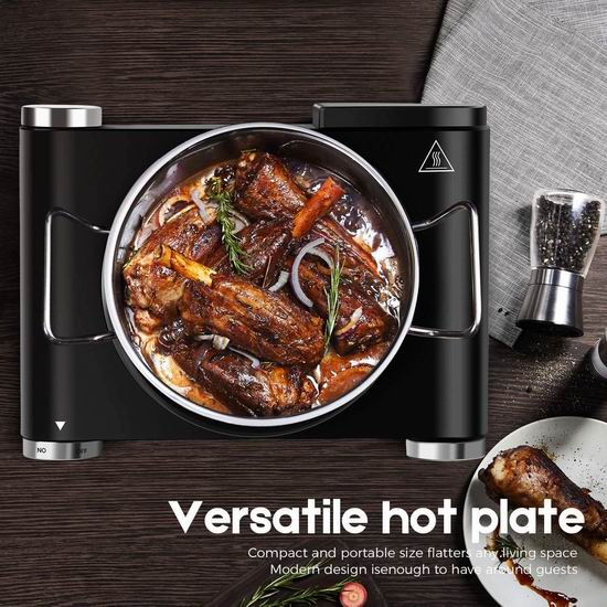 这款单头电炉外形小巧紧凑,7.4英寸铸铁加热板,受热均匀,易于清洁,功率高达1500瓦,加热功率可调,可作为炒菜、烧水、烫火锅、家庭备用及户外使用电炉。