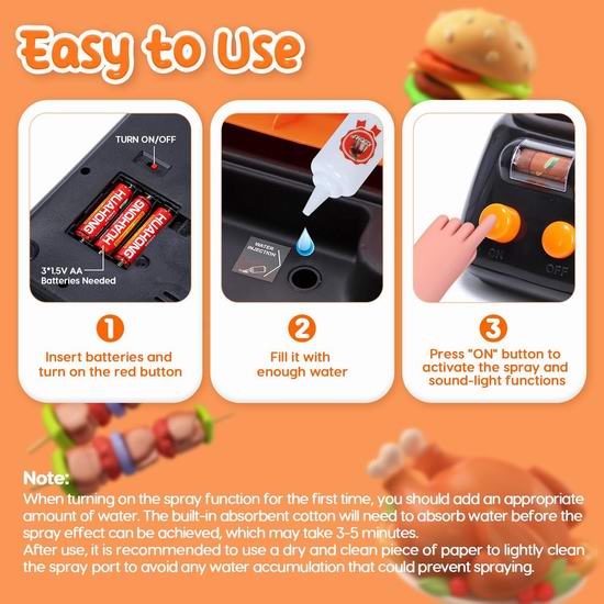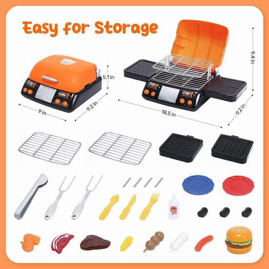 这款儿童烧烤玩具套装包含双层玩具烧烤架、仿真食物、餐具等玩具厨房配件,带来逼真的烧烤体验。加水后,烧烤炉会喷出水雾,模拟蒸汽,并带有声光效果,为角色扮演游戏增添真实感。他们可以和朋友们一起烹饪美味佳肴,从而提升想象力和创造力。所有厨房玩具均可方便地收纳在烧烤炉内部,无需额外的收纳容器。