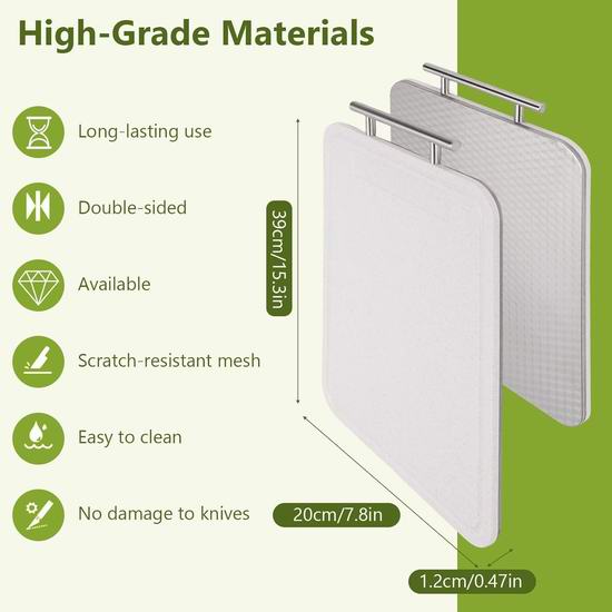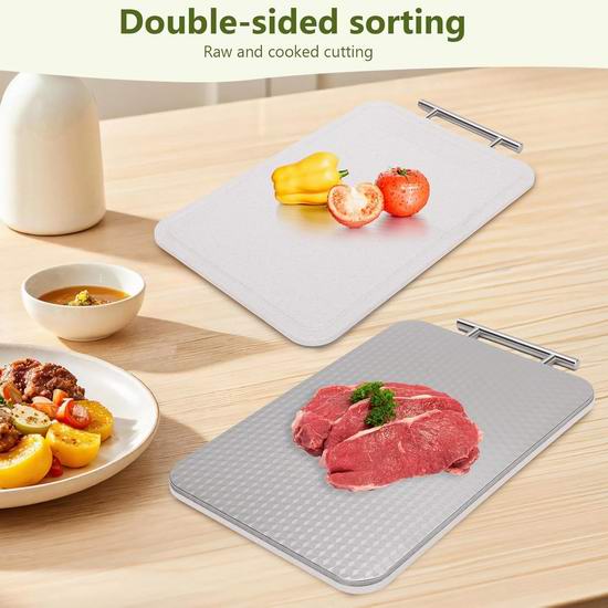 菜板采用双面设计,一面为食品级304不锈钢,适用于处理肉类和鱼类;另一面为麦秸PP材质,适用于水果和蔬菜。既能满足您各种食物处理需求,又能确保不同类型食物之间不会交叉污染。不锈钢表面采用纹理网状结构,有效减少刀刃刮痕,同时保护刀刃。双面均采用不粘材质,只需用水即可轻松冲洗干净。内置提手方便悬挂晾干。尺寸为39 x 25 x 1.2厘米。