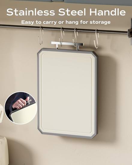 这款不锈钢菜板,一面采用不锈钢材质,可用于切肉;另一面采用天然麦秸纤维,可用于切蔬菜水果。双面均采用无孔设计,不会吸收食物的汁液和气味,有助于防止食物残留和异味,易于清洁。配备不锈钢手柄,方便悬挂和存放菜板。尺寸为42 x 28厘米。