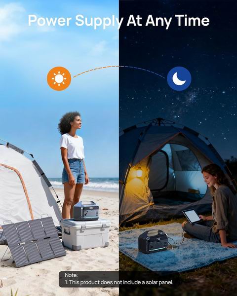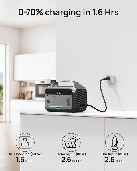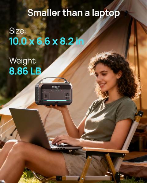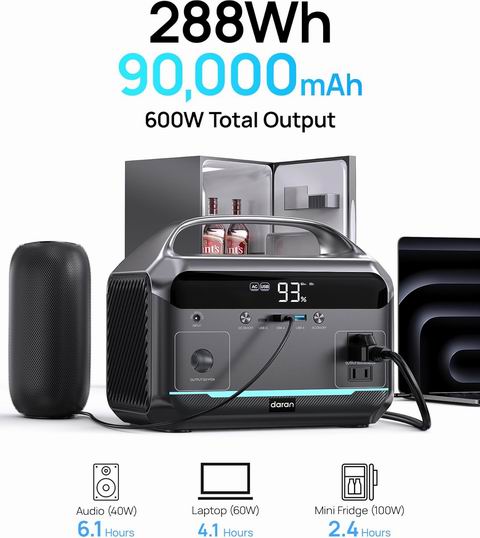 采用 288Wh(约 90,000mAh)的磷酸铁锂电池,机身仅 8.86 磅,小巧耐用(防震外壳+加固手柄),可提供 600W 纯正弦波稳定输出、峰值 1200W,适用于家庭应急、露营和旅行;配备 2 个交流插座、车载口、1 个 Type-C 和 2 个 USB-A,可同时为 6 台设备供电/充电;支持墙充、车充及最高 100W 太阳能输入(太阳能板等配件需另购),交流快充约 2 小时可充至 80%;内置 BMS 温控与过载保护,零噪音无废气,且带三模式 LED 灯(常亮/频闪/SOS),适合室内紧急备用使用。