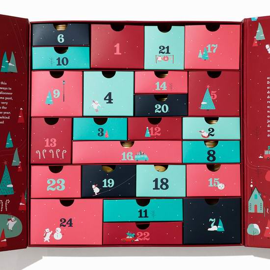 DavidsTea这款24天圣诞倒数日历,以茶香陪伴你的每一天。从果香草本、浓郁香料到丝滑奶香,共精选24款独特茶品。每款茶叶均为独立小罐散装茶,每罐可冲泡4杯茶水,共计96杯。口味包括有机橙香香料茶、苹果酒茶、有机西贡奶茶、有机洋甘菊梦乡茶、有机轻松妈妈茶、坚果乐园茶、有机伯爵奶香茶、香草卡布奇诺茶、茉莉焦糖布蕾茶、花生酱巧克力茶、水蜜桃奶香乌龙茶、血橙提神茶、薄荷拐杖糖茶、有机头痛舒缓茶、荔枝安睡茶、覆盆子莫吉托茶、焦糖酥饼茶、有机感冒舒缓茶、蓝莓松饼茶、静夜茶、有机塞维利亚伯爵茶、有机花园伯爵茶、唇语红茶,以及有机丝龙茉莉茶。