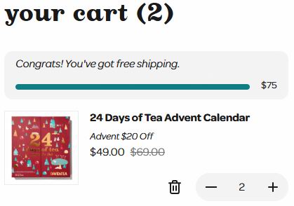DAVIDsTEA网店销售,购买2盒圣诞倒数日历茶叶礼盒,无需折扣码,单价立减20加元,降至49加元(原价69加元,)满75加元包邮。点击进入订购页面