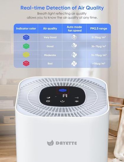 通过CARB、FCC、ETL认证,360°环形进气,采用真正的 H13 HEPA 空气过滤器,每小时可净化1290平方英尺(120平方米)房间内的空气,可过滤 99.97% 的 0.3 微米颗粒的灰尘、异味、皮屑、花粉尘和烟雾。搭载PM2.5空气质量传感器,可通过指示灯显示空气质量情况。4种风速选择,具有自动运行模式,根据当前空气质量自动调节净化风速。睡眠模式时运行噪音低至22分贝,并关闭全部灯光,不会打扰睡眠、工作或学习。