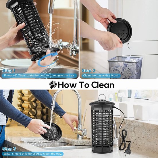 这款灭蚊灯使用11瓦紫光灯将蚊子,苍蝇,飞蛾、黄蜂、甲虫和其他飞行昆虫吸引到电动灭蚊器中,然后通过内部1800伏高压电网杀死它们。最大覆盖面积可达20-50平方米,可以放置在地面或桌面,或悬挂于空中使用,防水设计,室内室外都可以使用。装置底部设有可拆托盘,可方便清除被杀死的昆虫。