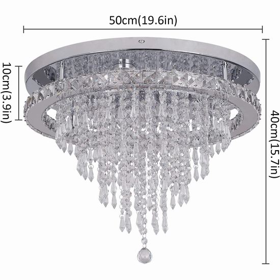 采用优质不锈钢外壳+优质K9水晶玻璃制成,圆形多环设计,简约时尚,坚固耐用,内置LED芯片,具有冷白色温(价格高的一款具有暖白、自然白和冷白3种色温),光线柔和不刺眼,节能环保,整体尺寸为50L x 50W x 40H厘米。