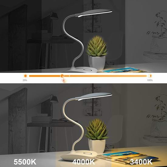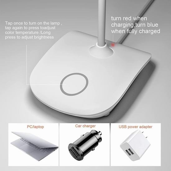 这款LED台灯提供三种色温(白光、暖光、暖白光),每种模式均可无级调节亮度。全亮度400流明,无频闪,无暗区,节能护眼,有效缓解眼部疲劳。内置1800mAh可充电电池,充满电后可在最高亮度下持续工作4-6小时。随附1.5米USB充电线,可接入USB电源持续供电照明。