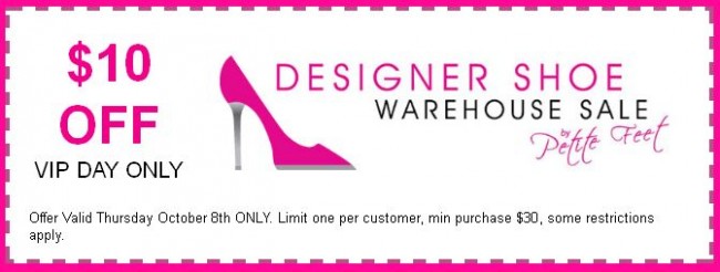 Designer Shoe Warehouse Sale将于10月8日-12日在多伦多机场附近举行,3万双5-11码鞋子2折起清仓销售,现金付款额外9折。10月8日为VIP Day,当日凭折扣券(如下图,点此下载)额外享受满30元立减10元优惠。