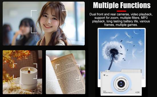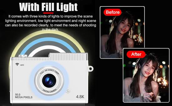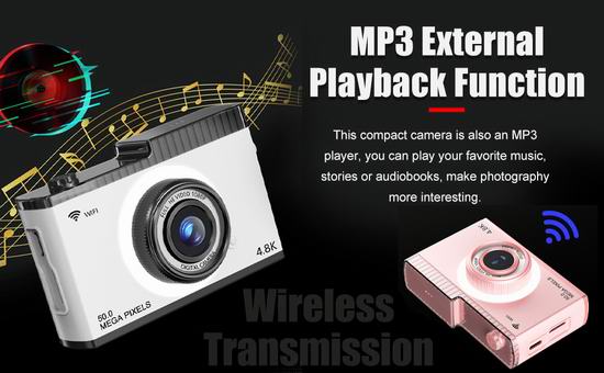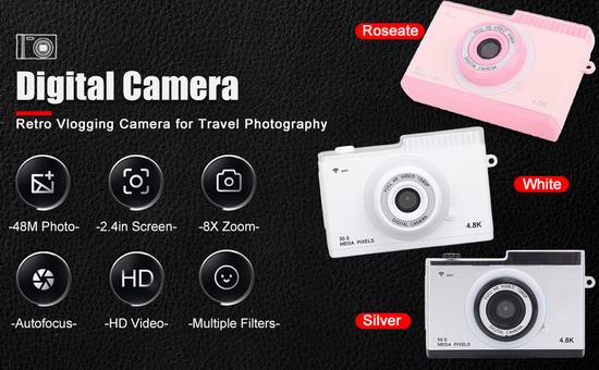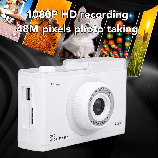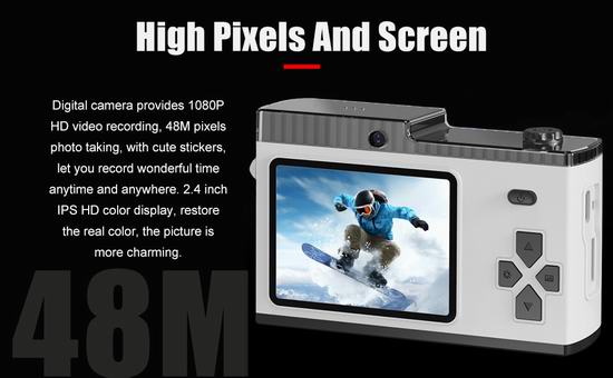 这款数码相机提供 1080P 高清视频录制、48M 像素照片拍摄,让您随时随地记录美好时光。搭载2.4英寸 IPS 高清彩色显示屏,配有三种灯光,可改善场景照明环境。支持8倍数码变焦,智能防抖,远距离画质出色,微距功能,对焦精准,每幅图像都细腻高清。采用自动对焦技术,可自动捕捉拍摄对象。内置MP3播放器,可以播放自己喜欢的音乐、故事或有声读物。相机支持 OTG、无线保真传输两种模式,可轻松预览、下载和分享到社交平台。支持8G至128G存储卡扩展(不包括)。