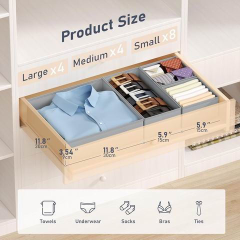 采用优质无纺布外层,内置加厚纸板支撑更稳固;底部双缝线拉链结构,几秒即可展开使用,不用时可折叠平放省空间。包含4个大号30×30×9cm、4个中号30×15×9cm和8个小号15×15×9cm,可按衣物类别分区整理,适用于衣柜、卧室或书架等场景,大号适合文胸内衣,中号可收纳内裤、袜子、围巾、瑜伽裤或化妆品,小号用于领带及各类小配件与办公用品;拉链式底部设计免额外放置底板,安装更省事。