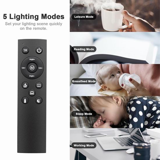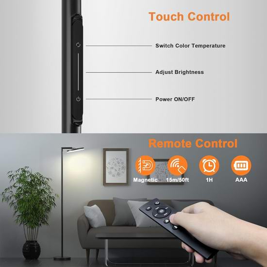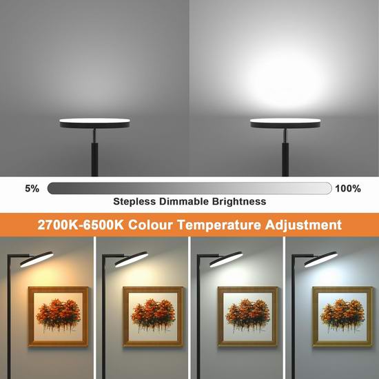 这款可旋转落地灯,提供2700K-6500K色温范围和5种照明模式,亮度可在5% 至100%之间无缝切换,无级调光功能可通过遥控器或触摸屏实现。支持1小时自动关灯,让您安享睡眠。灯头功率30瓦,亮度高达3000流明,提供柔和无眩光的照明。灯高175厘米,可350°旋转,85°倾斜,可根据需要调整照明角度。遥控器采用磁吸式设计,可吸附在灯具的金属外壳上。