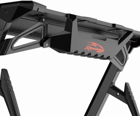 采用钢+ABS塑胶结构,碳纤维质感台面,结构稳固,不会晃动,内置RGB LED 6色彩灯,具有单色闪烁和多色循环模式,外形炫酷,配备杯架、耳机挂钩和游戏碟架,送超大防水鼠标垫,外形尺寸为L47.2 * W25.2 * H30英寸,最大承重330磅。