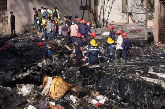6月12日下午,救援人员在印度艾哈迈达巴德坠机现场奋力灭火,浓烟笼罩着机体残骸。现场一片泥泞狼藉,飞机撞击地面后激起的水迹与碎片交织在一起。