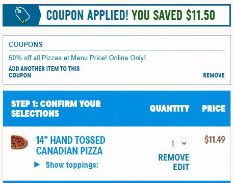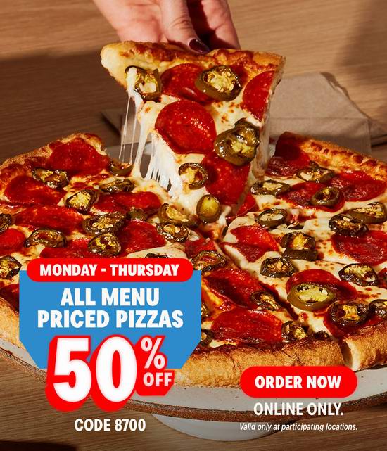 Domino's Pizza网店活动,2月9日至12日期间,通过手机APP或在线下单订购正价披萨,在购物车内使用折扣码:8700 享5折优惠,支持送餐或店内自取,点击进入订购页面。