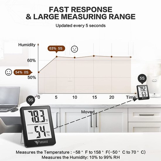 此款湿度计可准确测量室内温度、湿度,并显示舒适度情况,温度精度±0.5℃,湿度精度±3%,可挂于墙面或立于桌面。