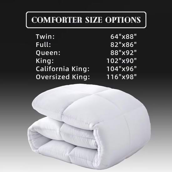 采用超柔软超细纤维涤纶面料,蓬松柔软。无噪音,透气性更好,不易撕裂,也不易产生异味。3D&7D 仿鹅绒填充,重量适中,不会太重,四季皆宜,倍感舒适。箱式针迹结构,防止填充物移位或结块,确保长时间保持光滑外观和柔软触感。尺寸为104x96英寸。